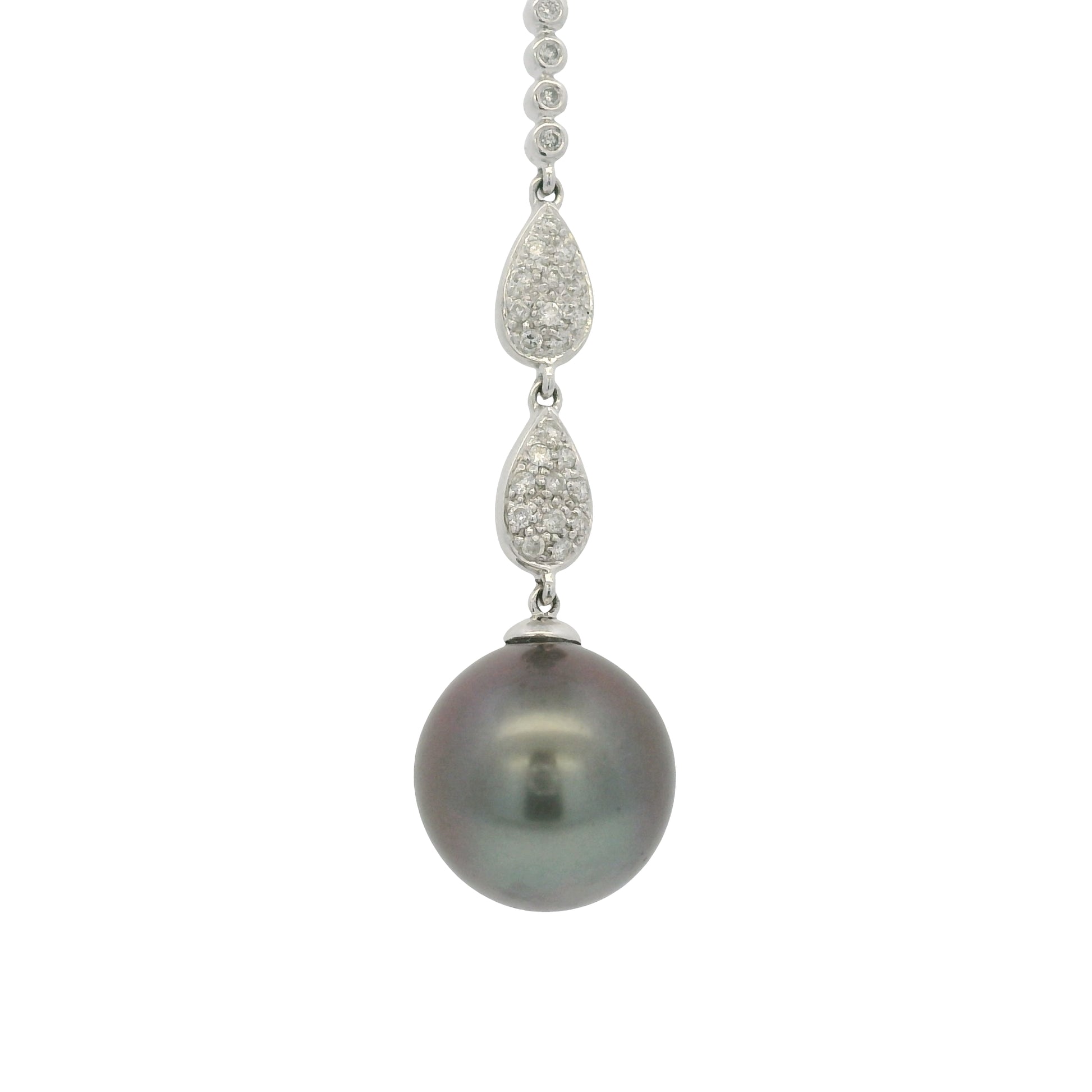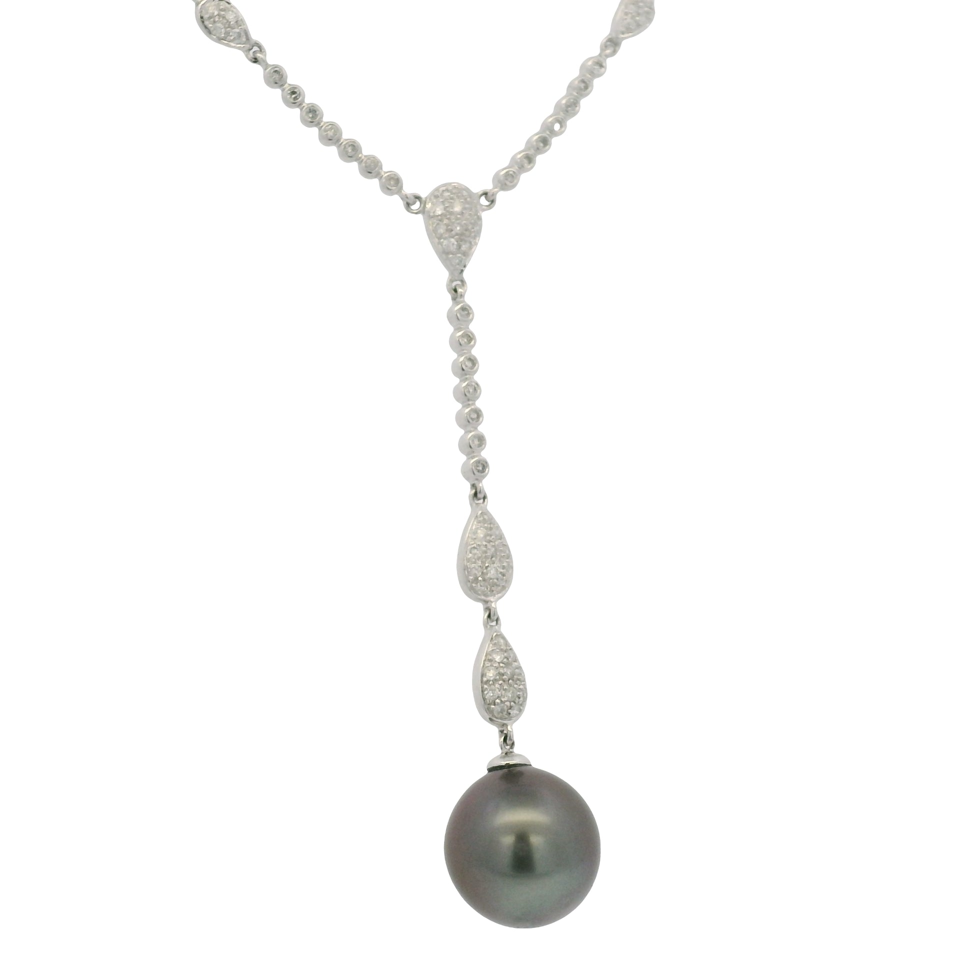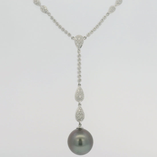 14k White Gold Black Pearl & Diamond Pave Drop Necklace