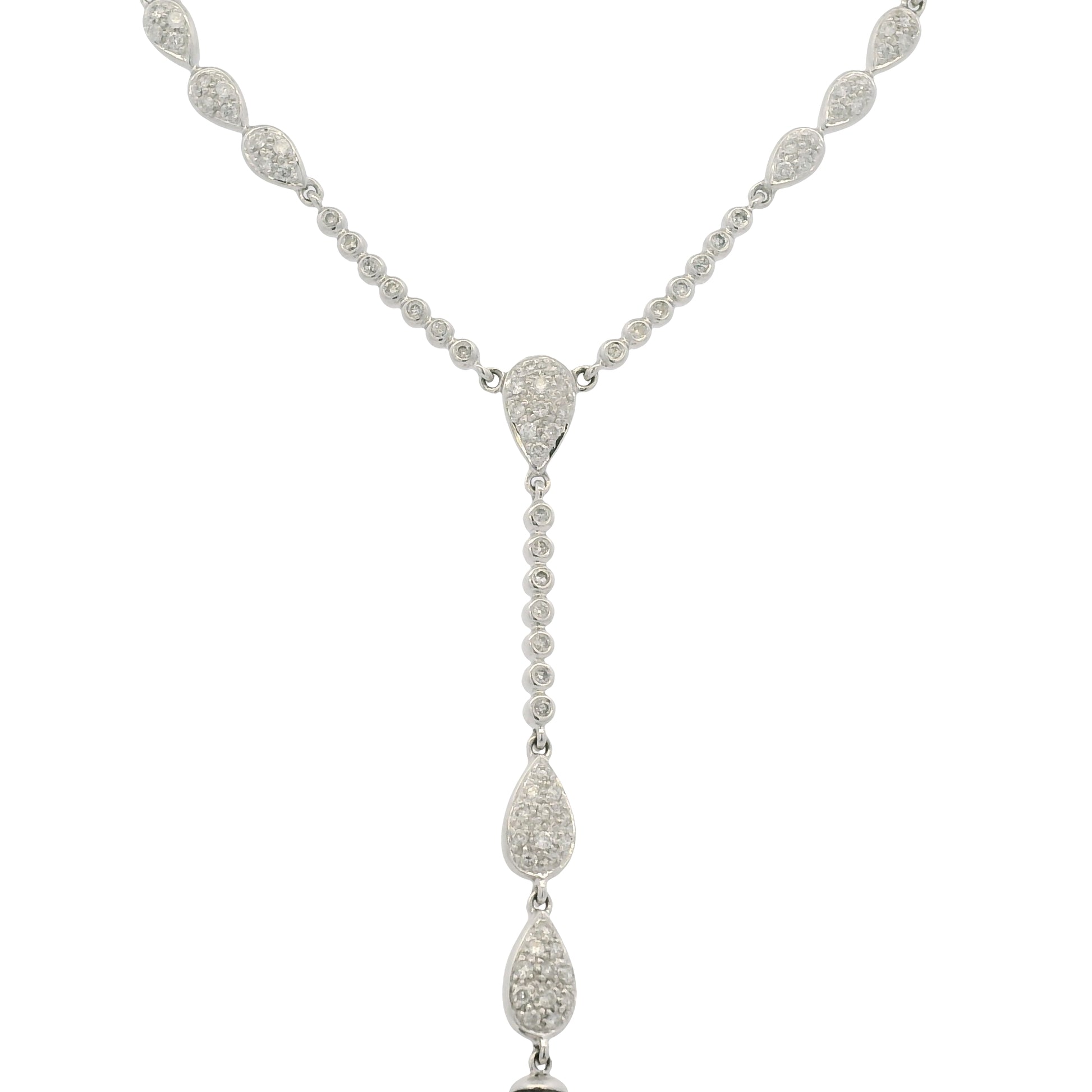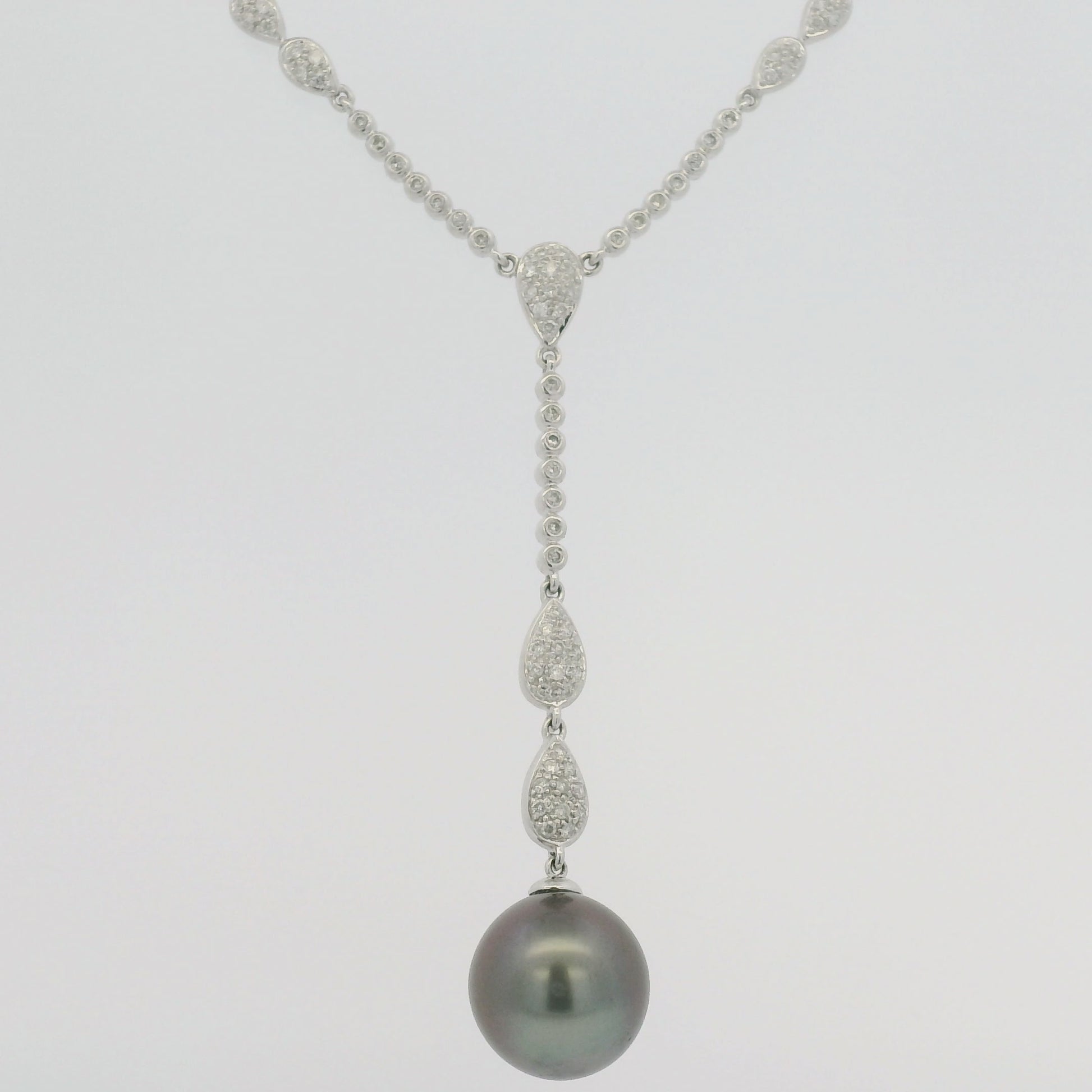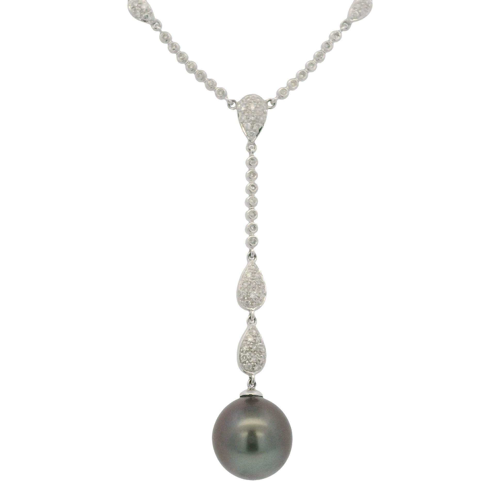 14k White Gold Black Pearl & Diamond Pave Drop Necklace