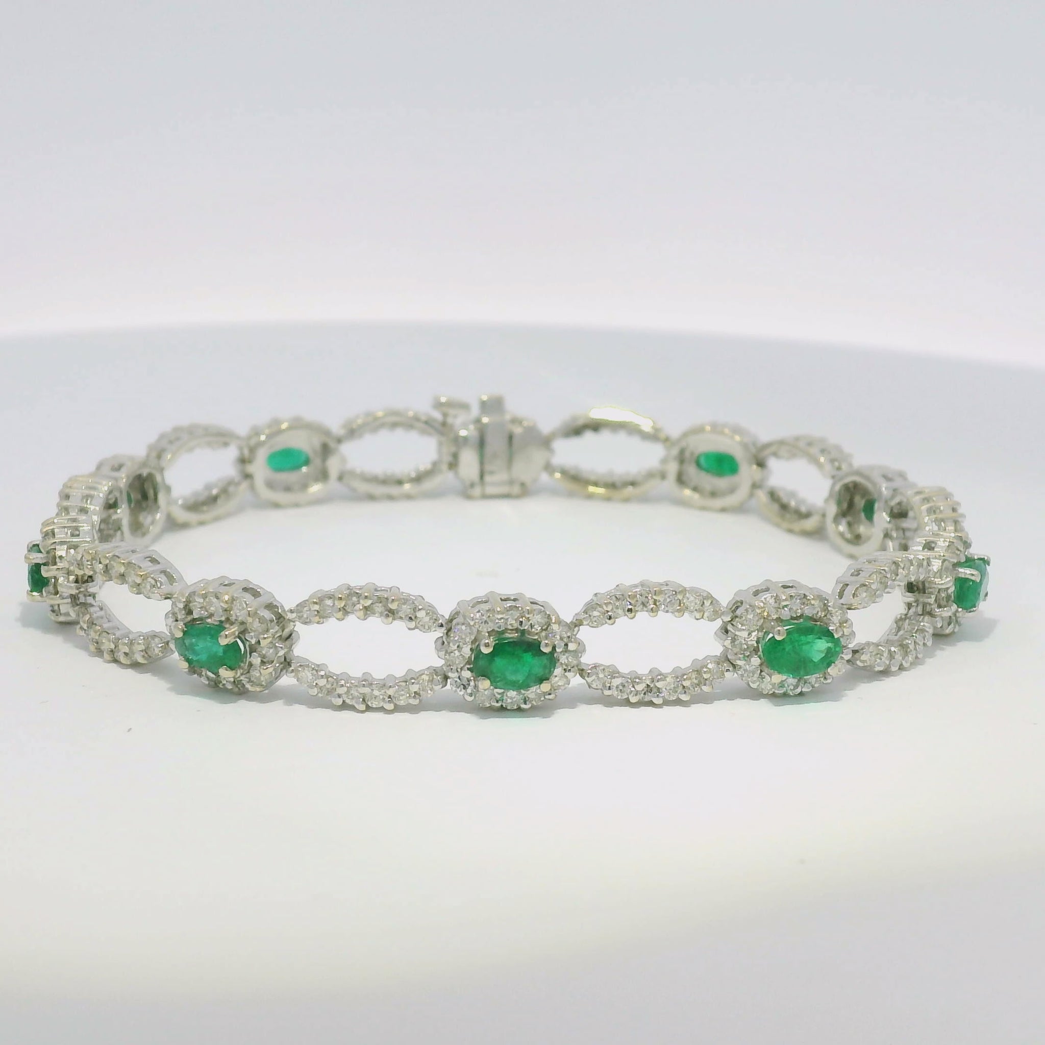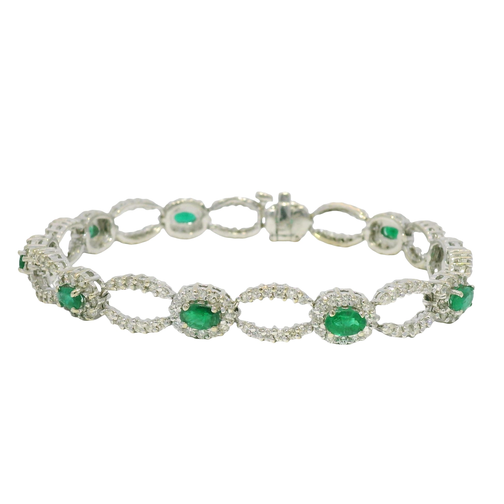 14k White Gold Natural Emerald & Diamond Open Link Bracelet