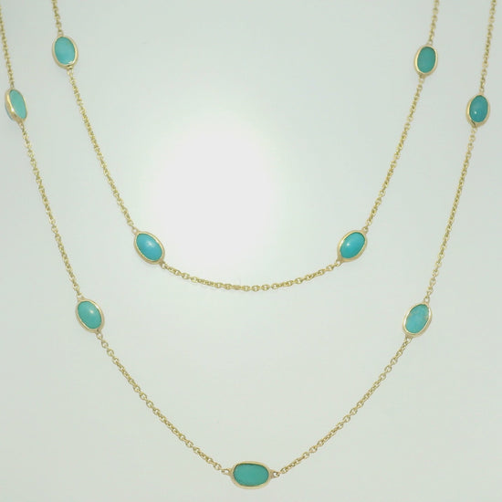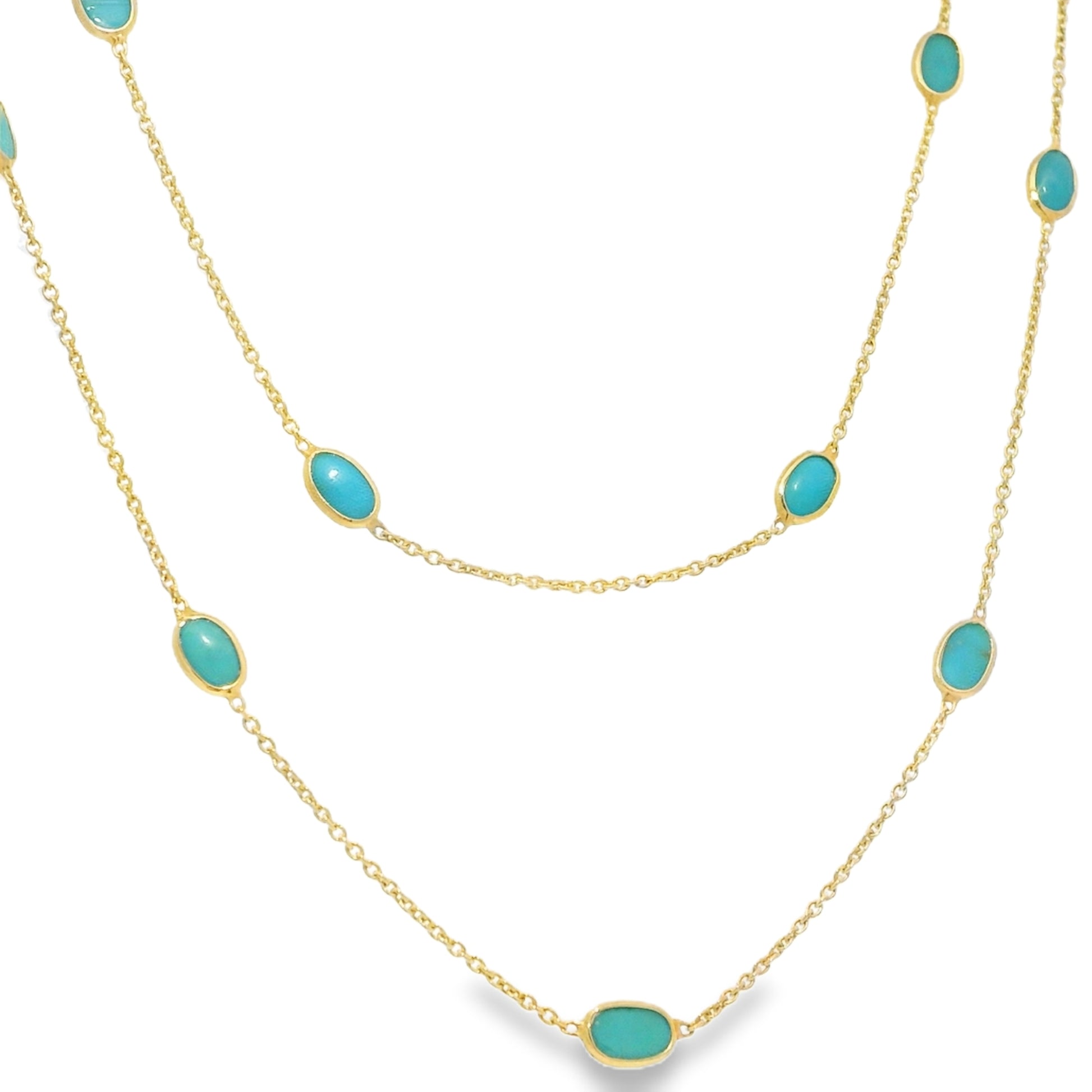 14k Yellow Gold 38" Long Turquoise Bezel Set Station Necklace