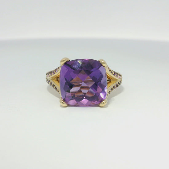 | Gemstone Details | The main gemstone is a purple, cushion cut, Amethyst gemstone. There are also amethysts set in the mounting and the ring has approximately 5.8 carats total. |