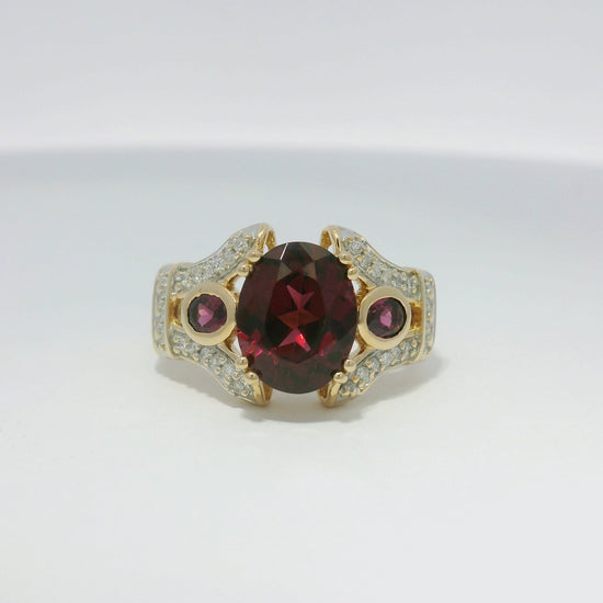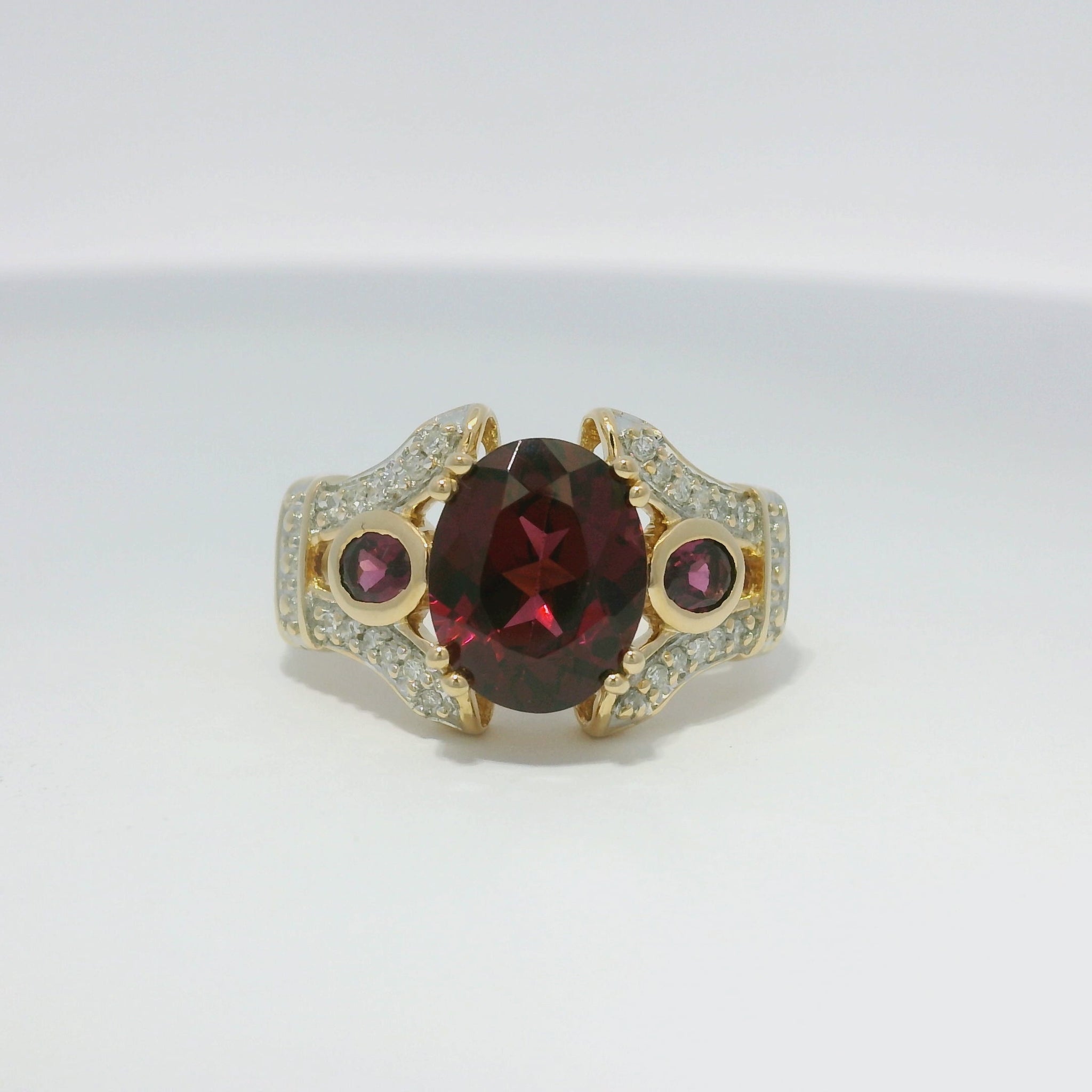 | Gemstone Details | There are (3) natural, Oval shaped and round brilliant cut, Garnet gemstones and approximately 0.12 carats of natural diamonds in the mounting. |