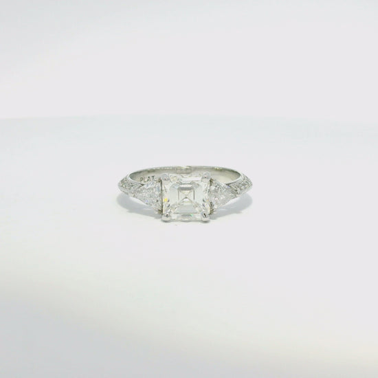There are 2, natural, trillion cut diamonds along each side of the main diamond, weighing 0.50 carats total. There are an additional 0.24 carats of round brilliant cut diamonds on the mounting. The diamonds in the mounting are approximately G/H in color and SI in clarity. |