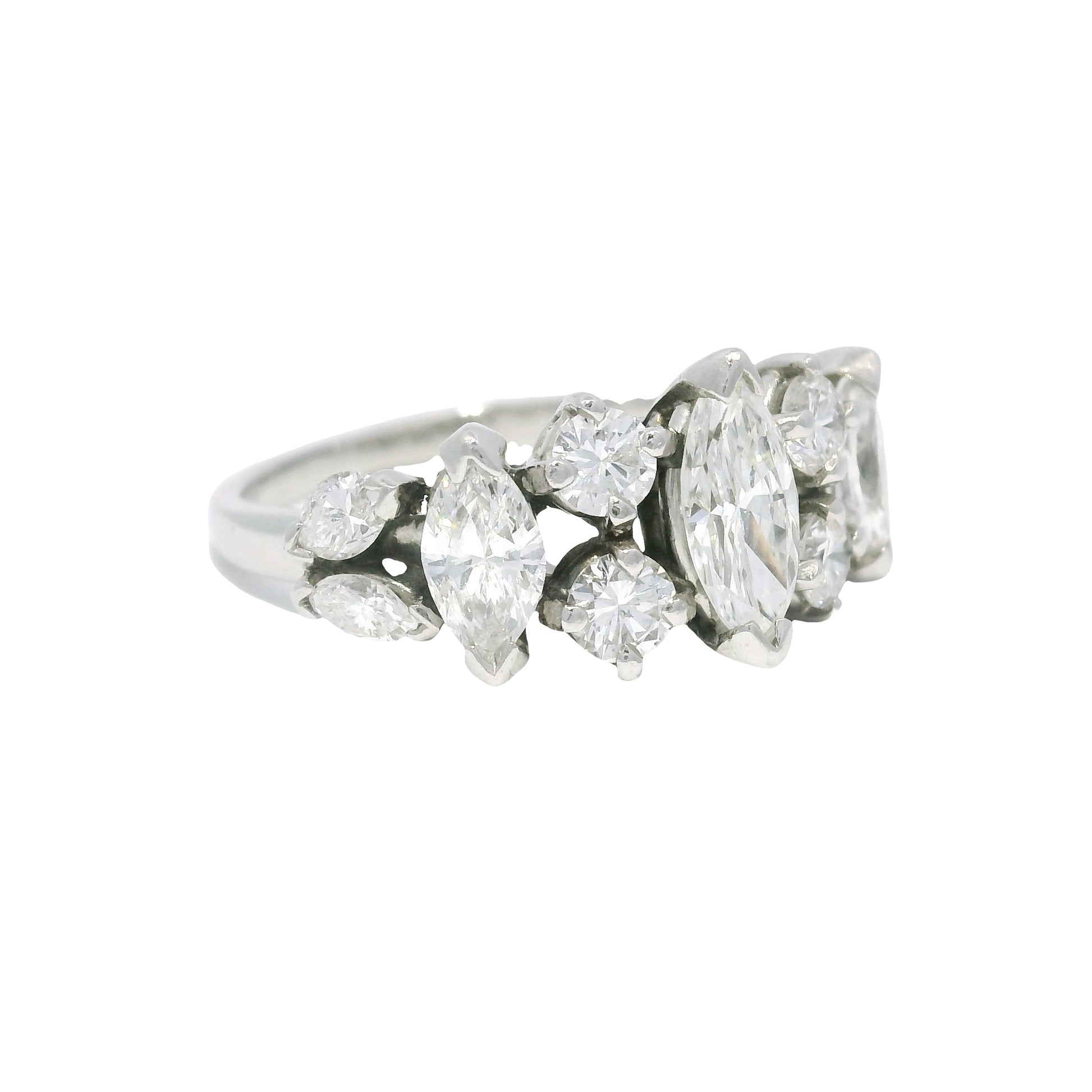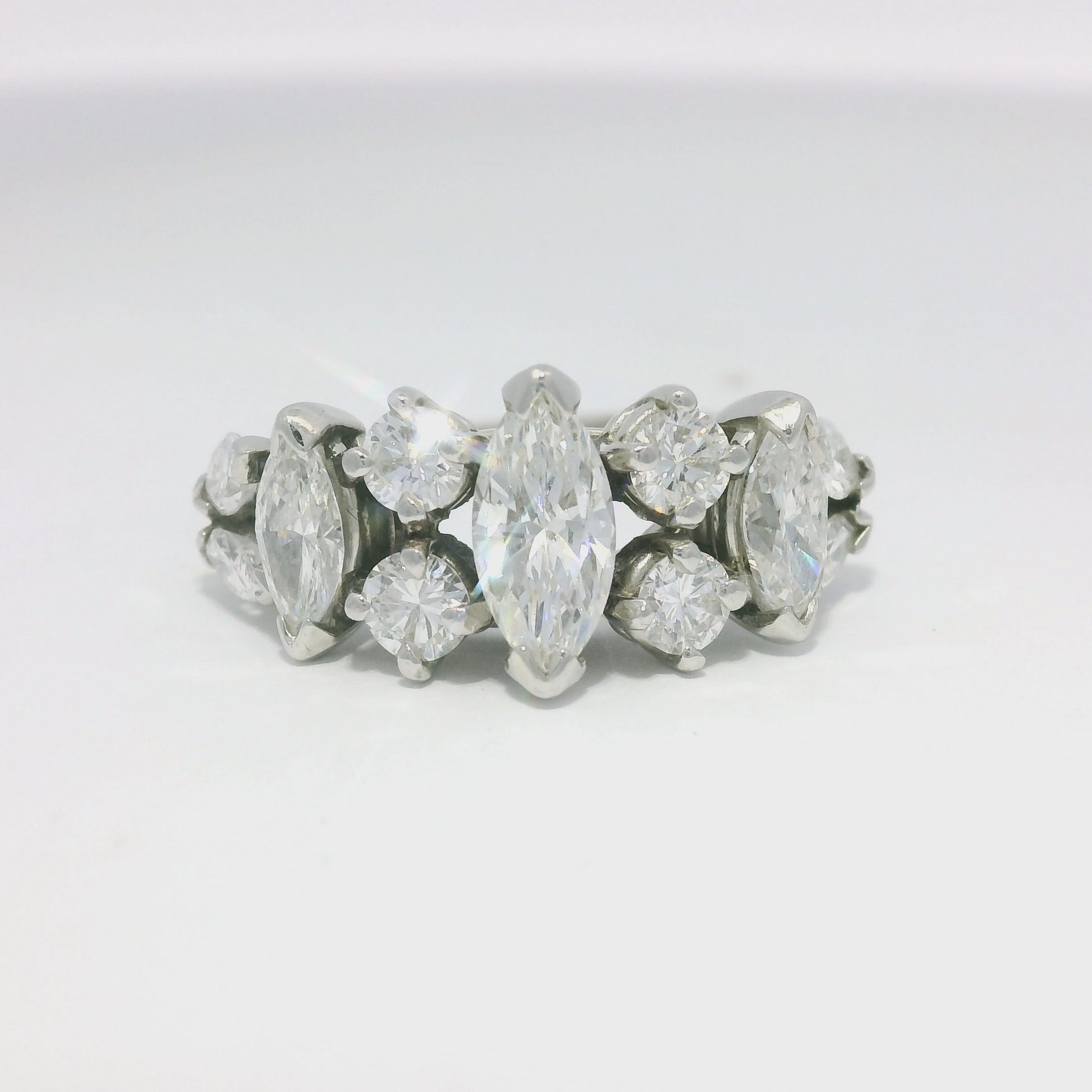 There are (7) natural, Marquise cut diamonds and (4) natural, round brilliant diamonds weighing approximately 1.30 carats total. |